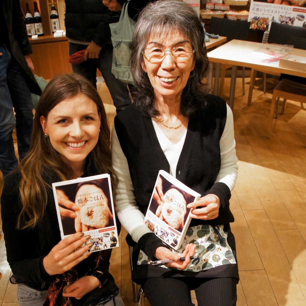 With Hashimoto mama at the launch of “Hashimoto’s Tohoku Recipes” in Tokyo last week. In true Hashimoto mama style, she even prepared volunteer favorites beef tongue stew and abura-fu rice bowl, and served them at the store!