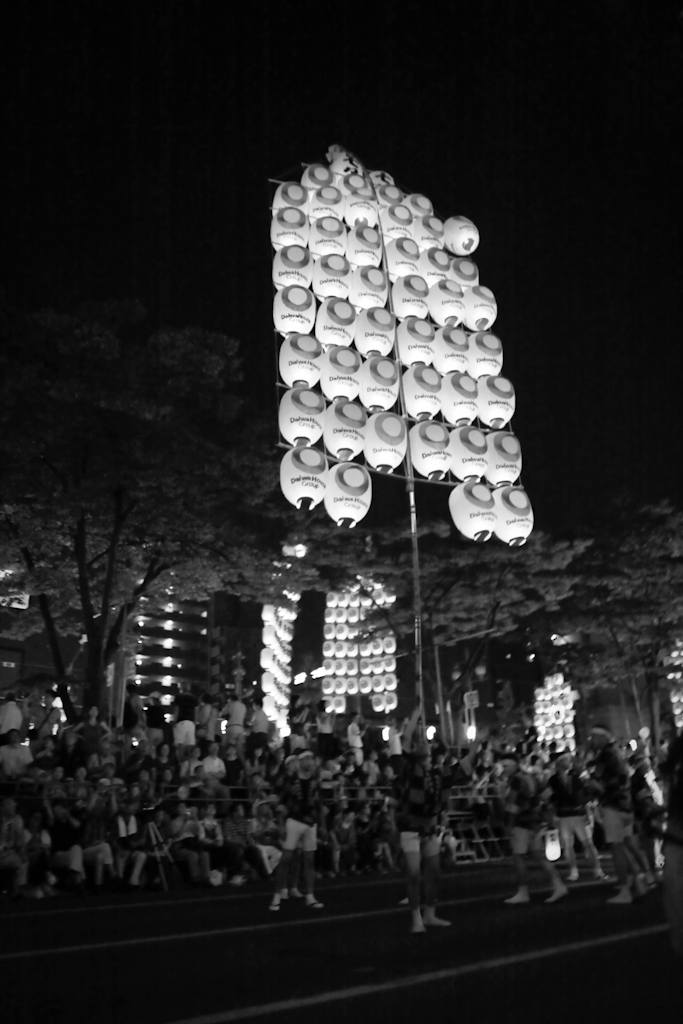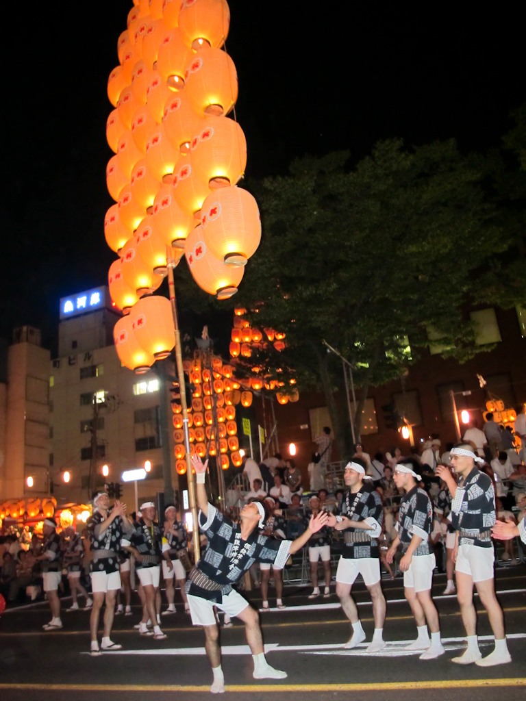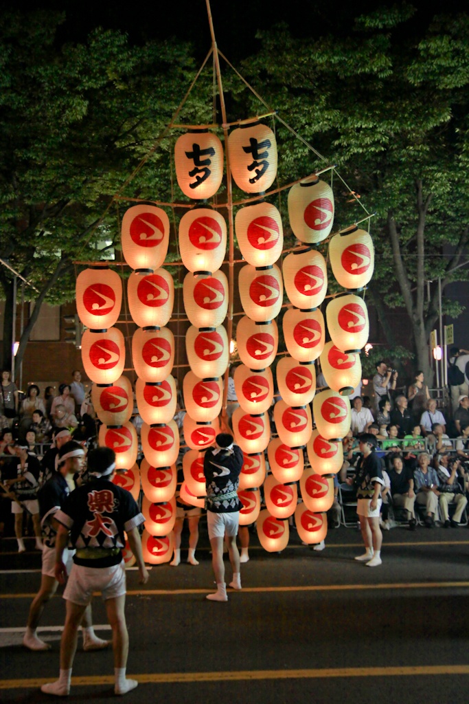 The night parade (held each night of the festival) is the main attraction, where men work together in groups around a kanto, taking turns to show off their acrobatic talents and encouraging their teammates with a hearty “dokkoisho, dokkoisho” (heave, heave). Every so often the drums and flutes stop and groups move forward along the road, allowing spectators to view a new group.