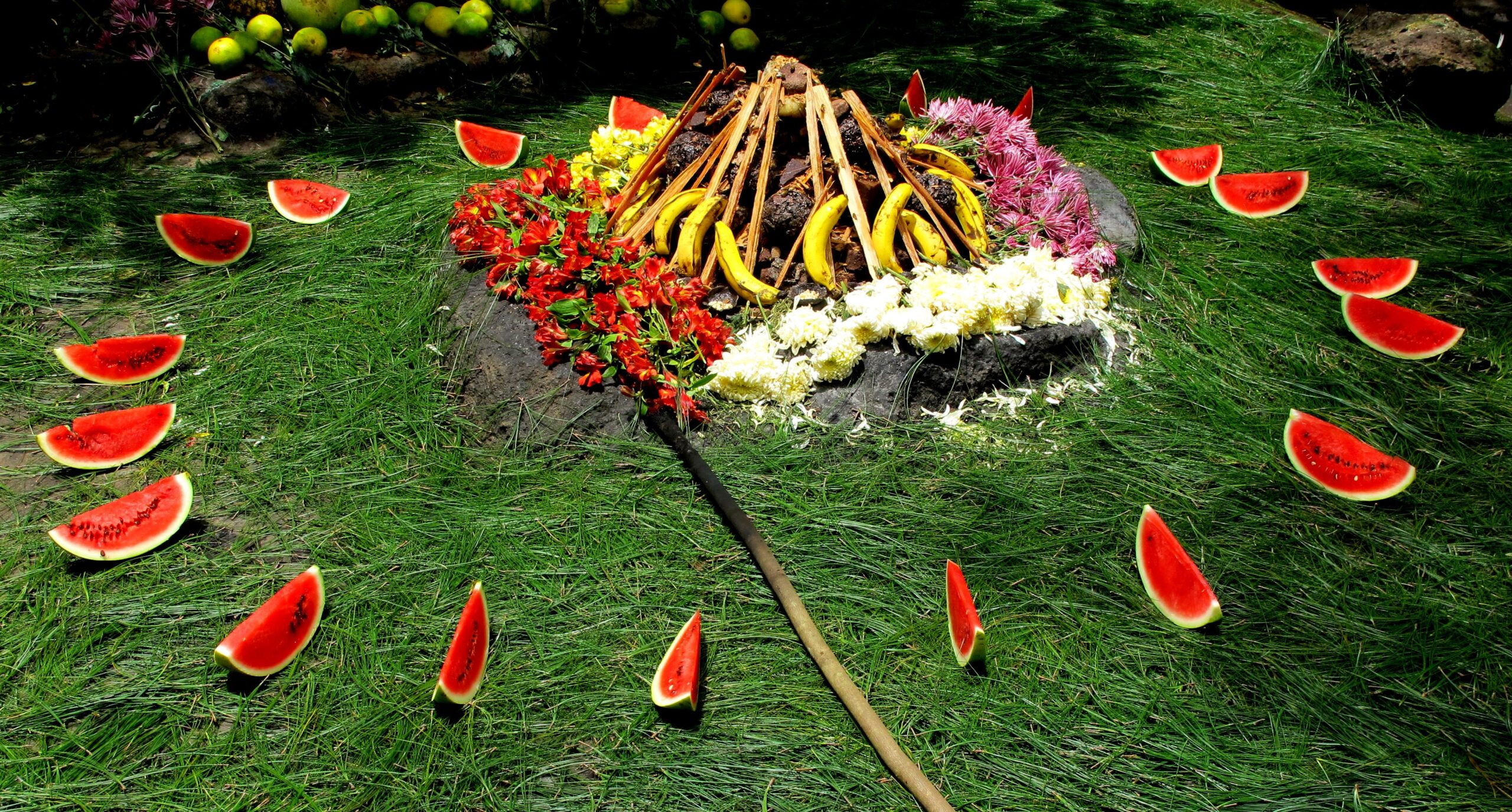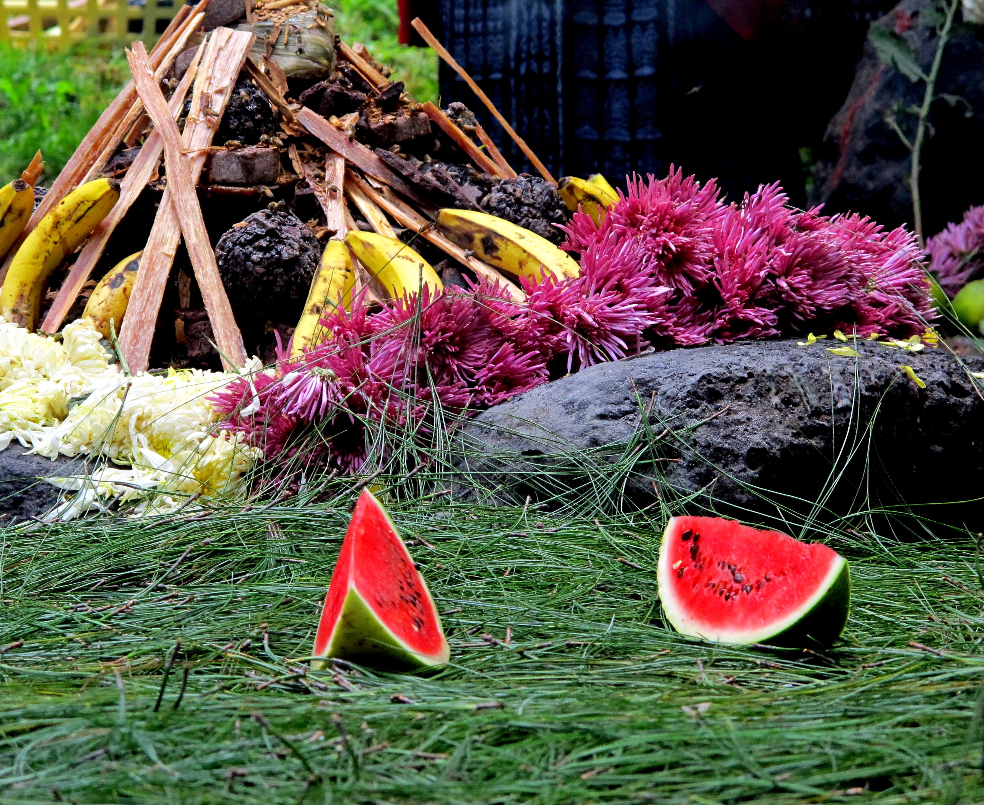 Some locals then led us into the forest for the ceremony where they had arranged a small fire with flowers and fruits laid out in a circular formation. The various colors represent the different natural elements, and give thanks to the Sun and Earth and all that they provide.