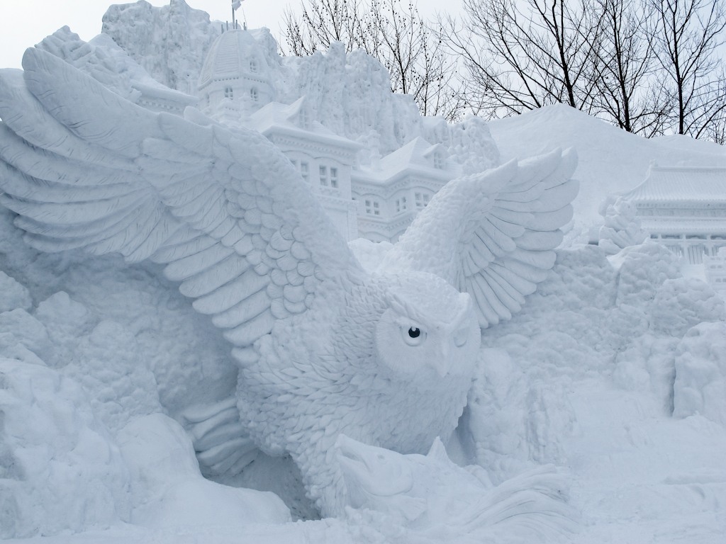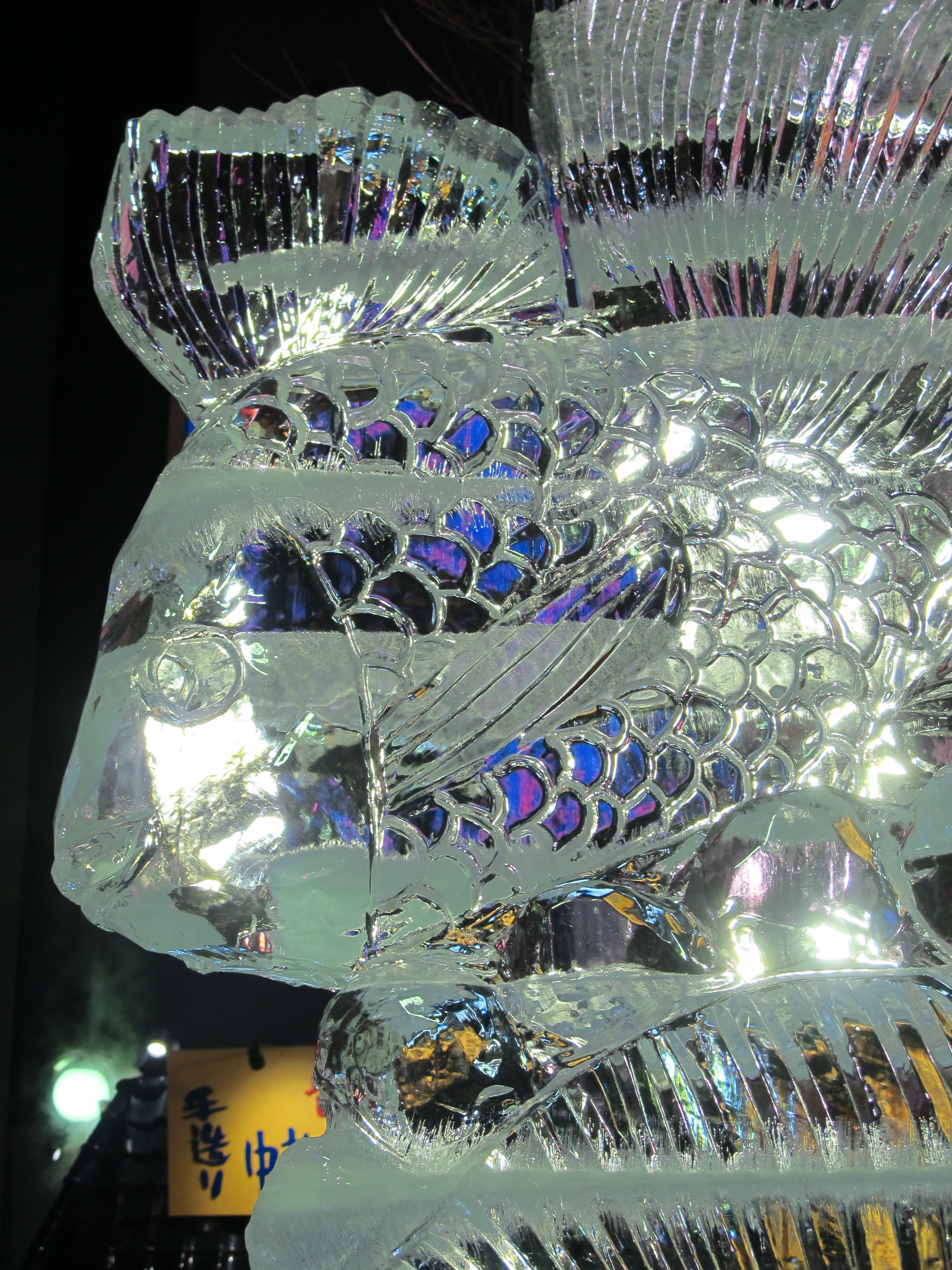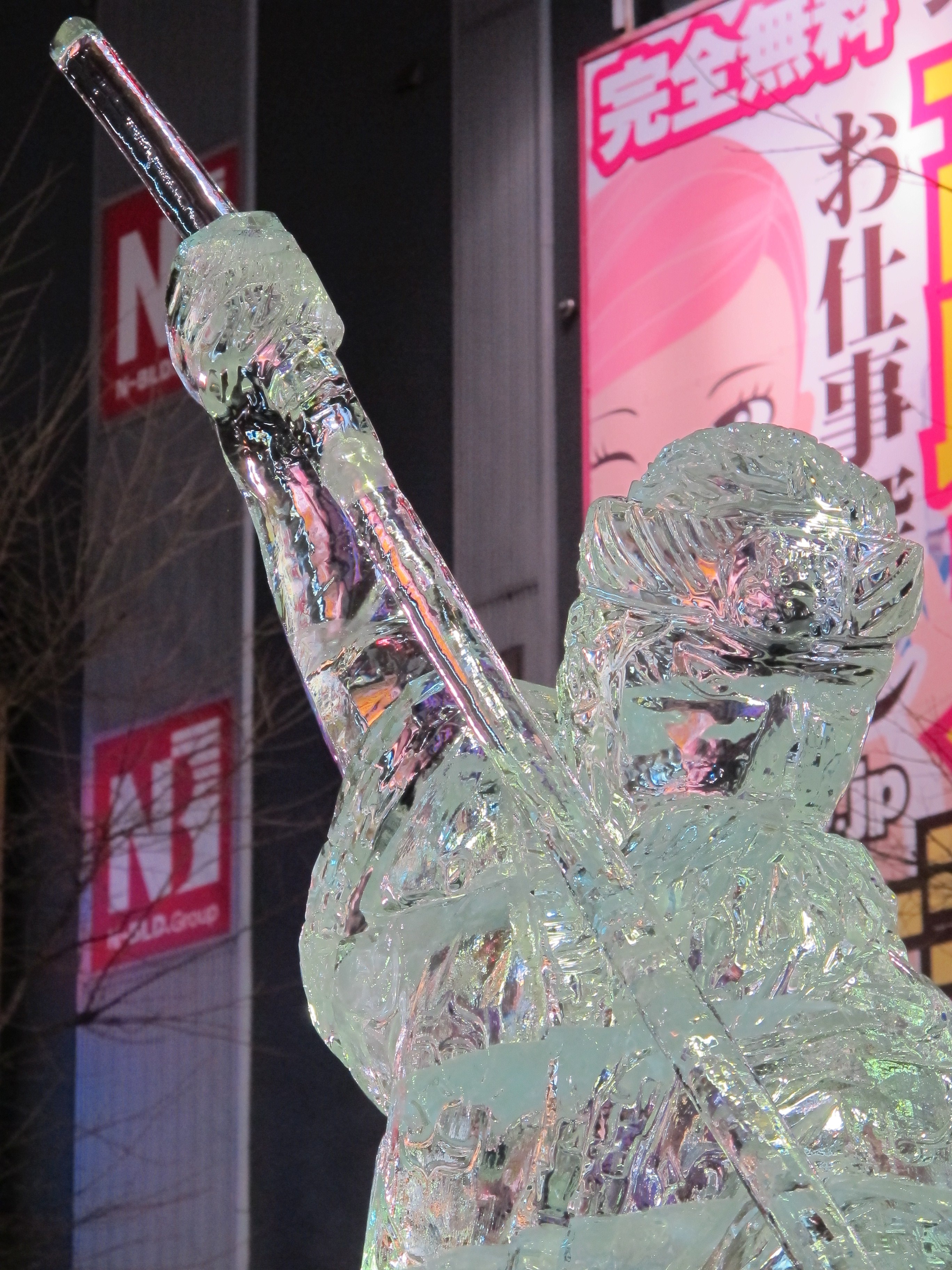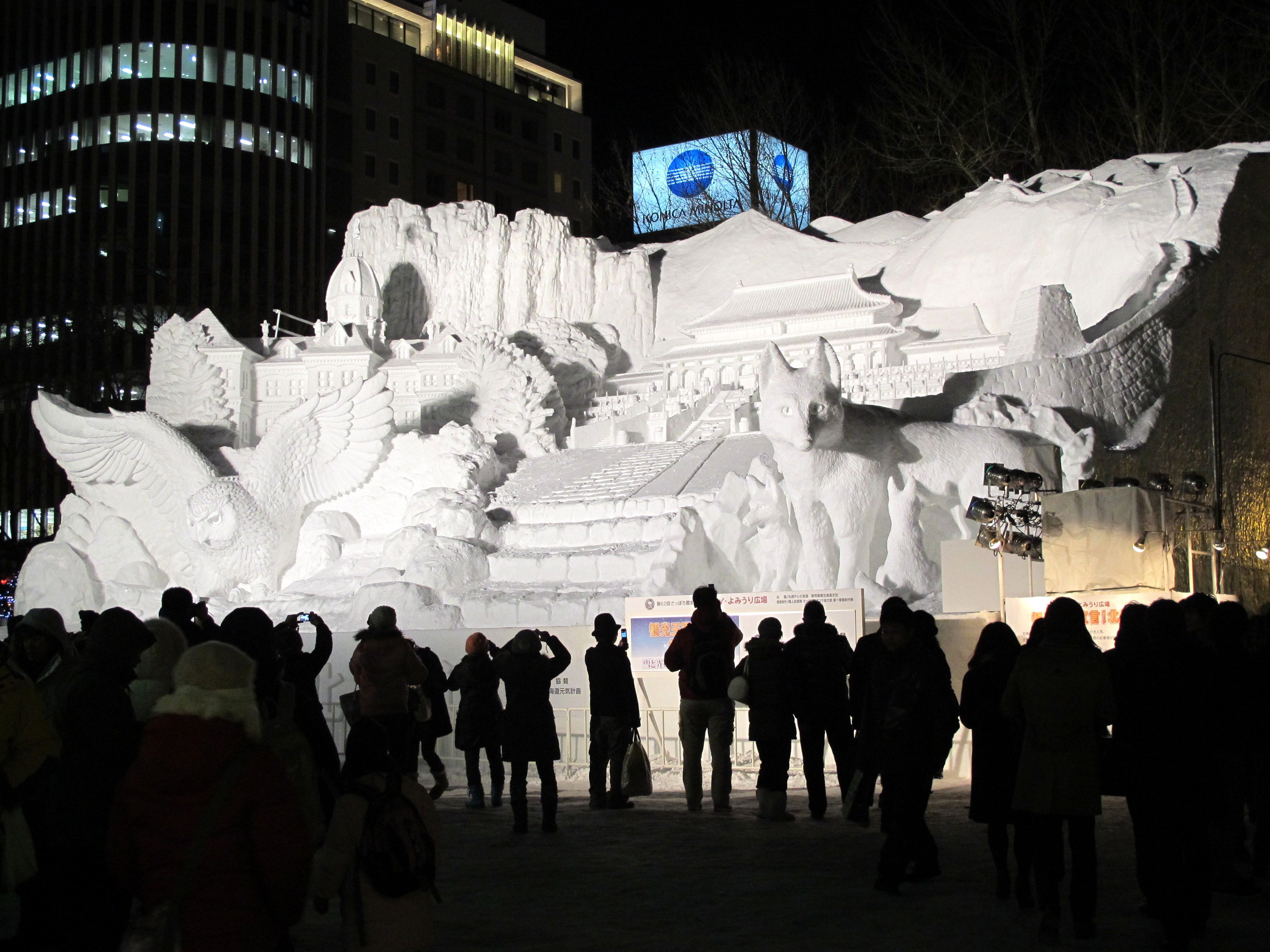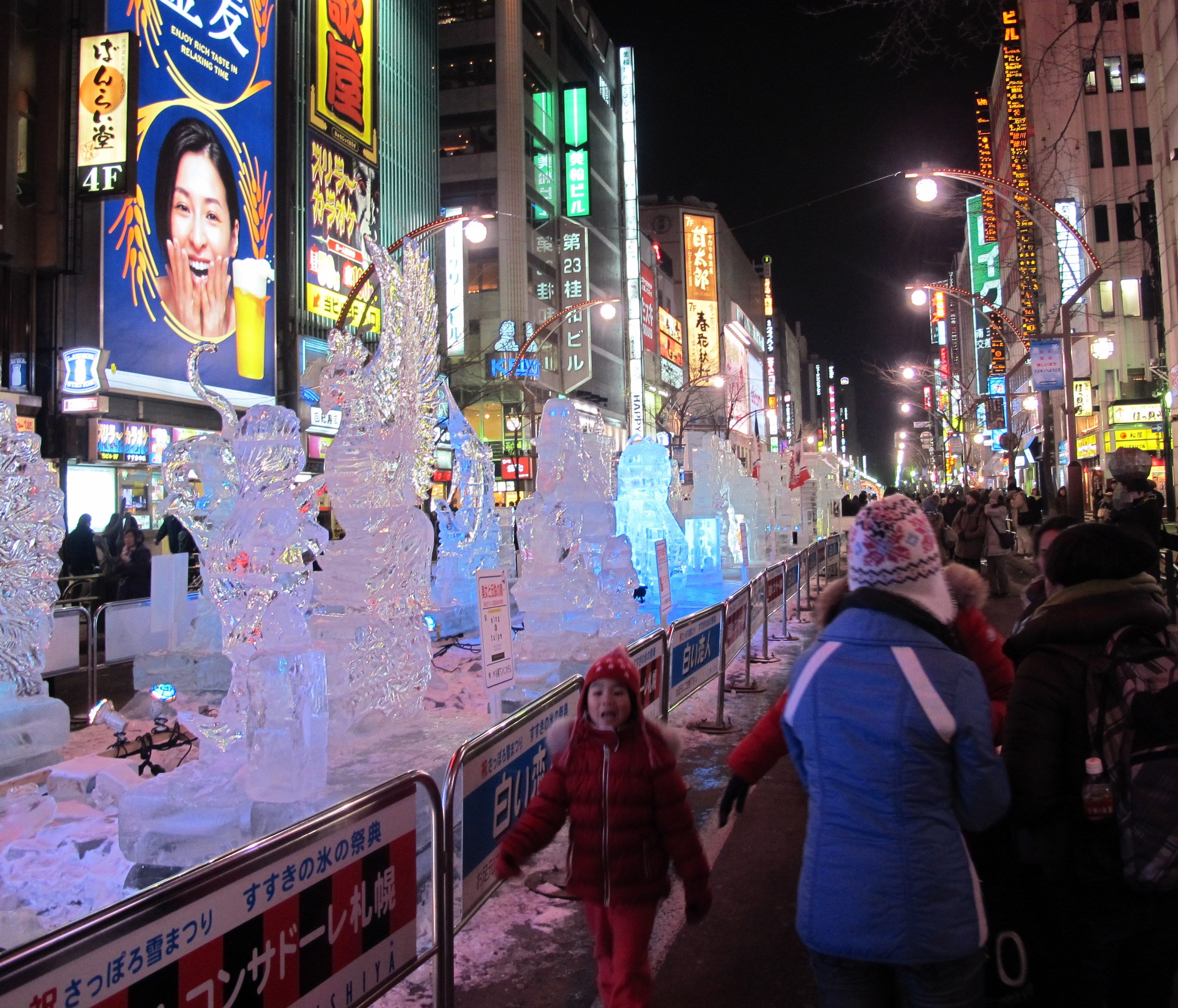 While the Odori site focuses on snow displays, at Susukino you’ll find an entire street of ice sculptures. The reflection of lights of nearby businesses onto the glistening carvings on show makes for an impressive sight.