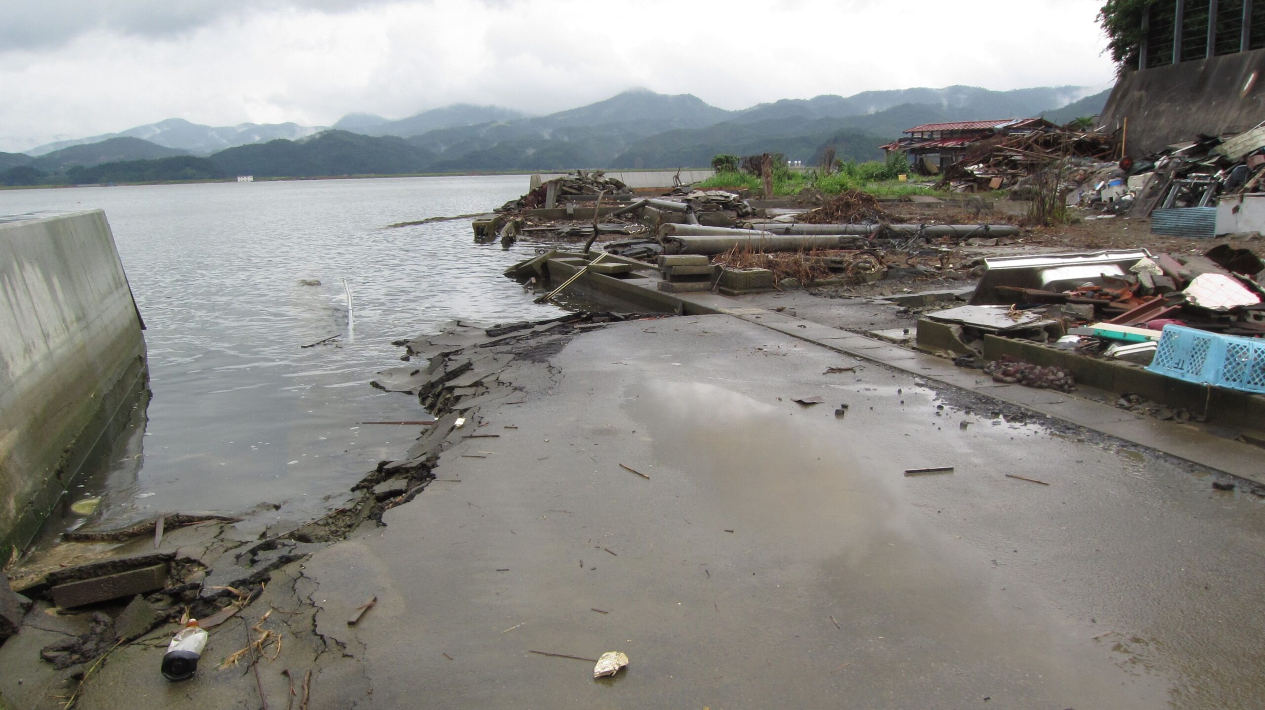 The next morning we emerged early from our tents to join Peace Boat volunteers for the day. After the usual radio taiso (morning exercises/calisthenics) and singing to wake us up for the day’s work, we received our assignment. Today we would be going to Onosaki, a town so devastated by the tsunami that the roads had been completely washed away. Access to the town had only been re-established six weeks earlier by way of a makeshift gravel road that had taken months in the making. Because the town had been completely cut off, it remained as it was the day the tsunami hit.